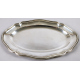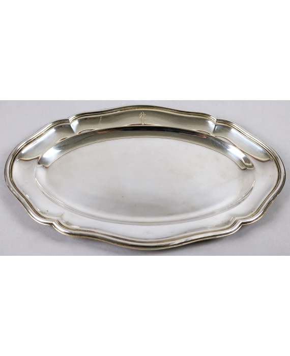 Vassoio ovale in argento 800 a bordo mistilineo, con monogramma inciso ed iscrizione sul retro. Peso gr. 1040