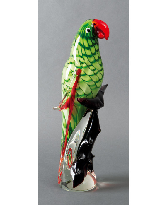 Pappagallo su ramo in vetro policromo di Murano, firmato sul fondo Toso Murano. Alt. cm51