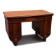 Particolare scrivania impiallacciata in legno di mogano, filettature ed intarsi in legni chiari a serti vegetali, tre cassetti, due sportelli laterali, di cui uno con all'interno tre cassettini intarsiati. Inghilterra, fine sec. XIX. cm81x128x70 (lievi difetti)