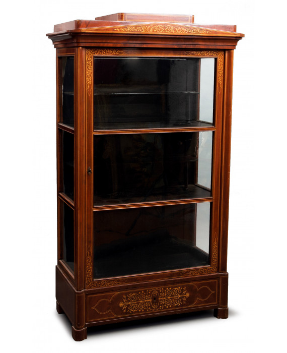 Elegante vetrina impiallacciata in legno di mogano, filettature ed intarsi in legni chiari a serti vegetali, uno sportello, un cassetto inferiore. Inghilterra, sec. XIX. cm172x101x50