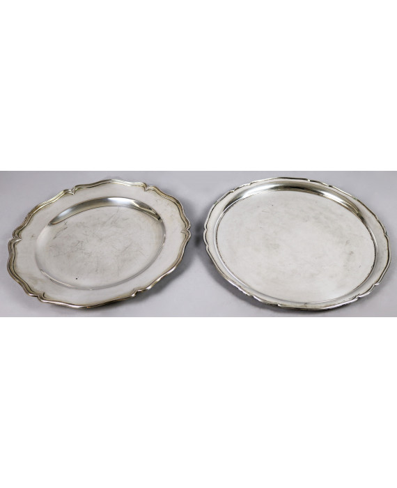 Lotto di due vassoi tondi in argento 800 a bordo mistilineo. Diam. cm40/36. Peso tot. gr. 1870