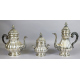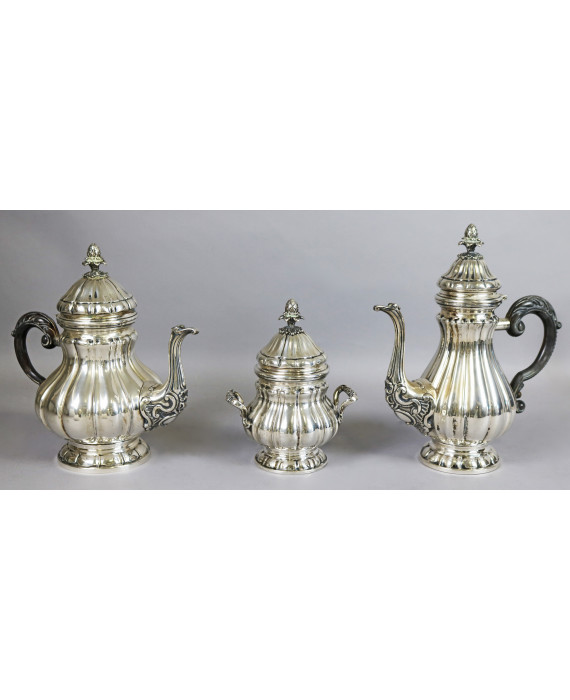 Servizio da tè e caffè in argento 800 a corpo costolato, pomoli a carciofo e manici a voluta, composto da teiera, caffettiera e zuccheriera. Peso tot. gr. 2450