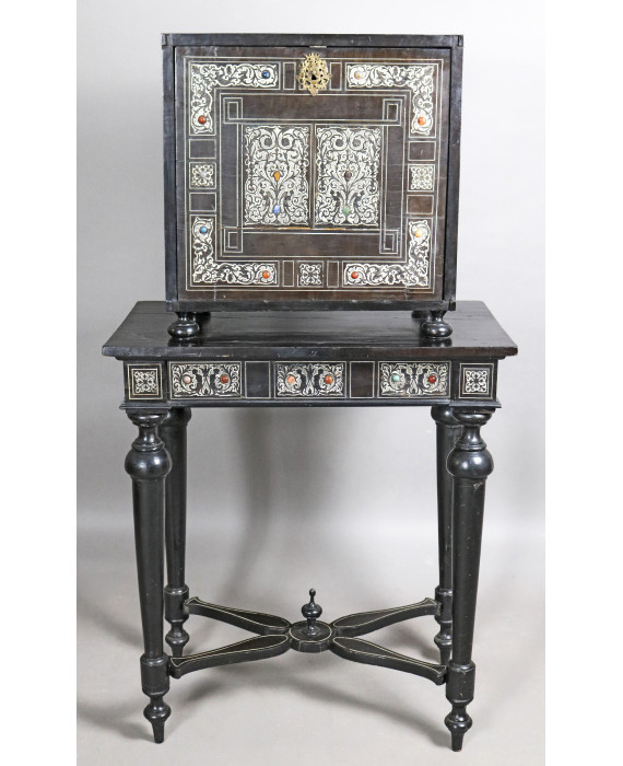 Monetiere in legno ebanizzato ed intarsiato a motivi vegetali e putti alati, inserti in pietre dure, calatoia con all'interno sei cassetti ed uno sportello centrale, tavolinetto inferiore d'accompagno. cm52x52x29/83x73x41 (difetti e mancanze)