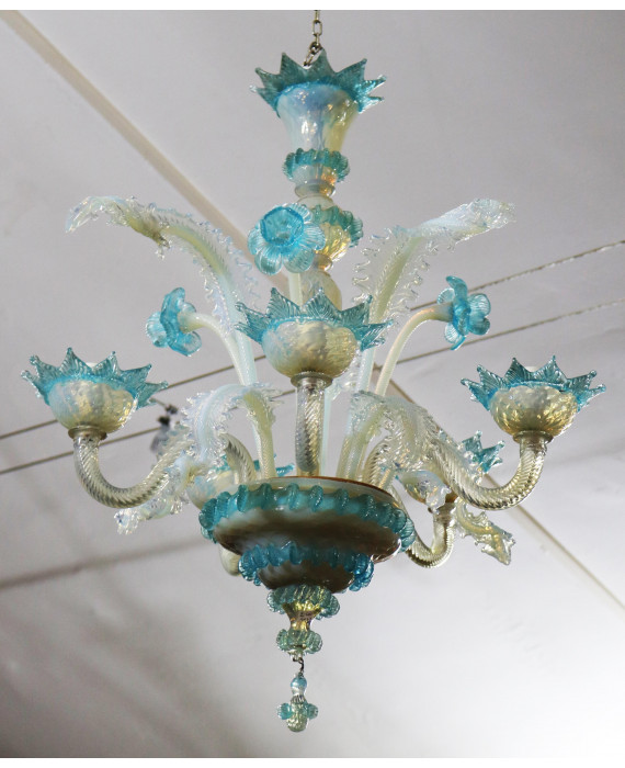 Lampadario a cinque luci in vetro lattimo ed azzurro di Murano. (lievi difetti e mancante di un elemento)