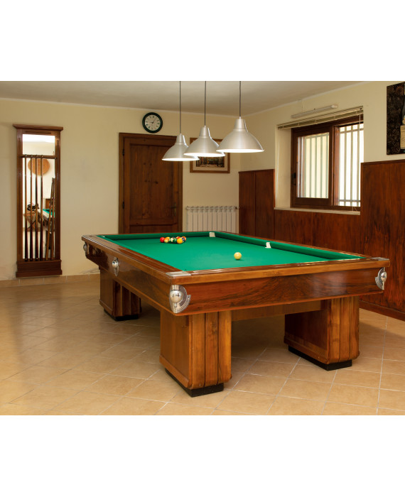 Biliardo a sei buche del periodo Decò impiallacciato in legno di noce, piano in lavagna, completo di palle e rastrelliera con sei stecche (ritiro a carico dell'acquirente presso l'abitazione del proprietario) (lievi difetti)
