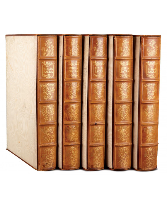 Biblia Sacra vulgatae editionis imaginibus Salvatoris Dalì. Sumptibus ex typis Rizzoli editoris Mediolani A.D. 1967. Opera in cinque volumi in-folio (mm 490x360). Pagine 380, [14], [2] bianche; 362, [18], [2] bianche; 346, [22], [6] bianche; 449, [14], [3] bianche; 435, [20], [3] bianche. Con, complessivamente, 105 belle tavole fuori testo dagli acquerelli di Salvador Dalì. Le tavole, impresse con tecnica mista serigrafica e litografica a colori, sono protette da veline didascaliche in carta Japon. Esemplare marginoso, perfettamente conservato nelle sue barbe. Bella legatura in piena pelle color cuoio, riccamente decorata con fregi fitomorfi e titoli impressi in oro al dorso a 5 nervi. Tagli superiori dorati e sguardie in moirè di seta avorio. Entro eleganti custodie in mezza pelle, con piatti e dorso in moirè di seta avorio, ben conservate. Copia n. 533 di una tiratura complessiva di 1797, una delle 1499 stampate su carta vergellata. Completo di sua custodia (abrasioni ai nervi e alle custodie e piccole macchie ai dorsi)