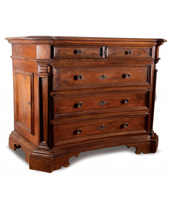 Grande e importante canterano a balestra in legno di noce, quattro cassetti, due sportelli laterali, paraste laterali piramidali. Italia centrale, sec. XVII. cm138x185x95 (lievi difetti)