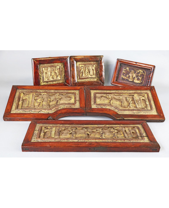 Lotto di sei pannelli in legno dorato ed intagliato con scene di vita orientale. Cina, sec. XX. cm27x46(2)/24x27(2)/21x30(23x63)