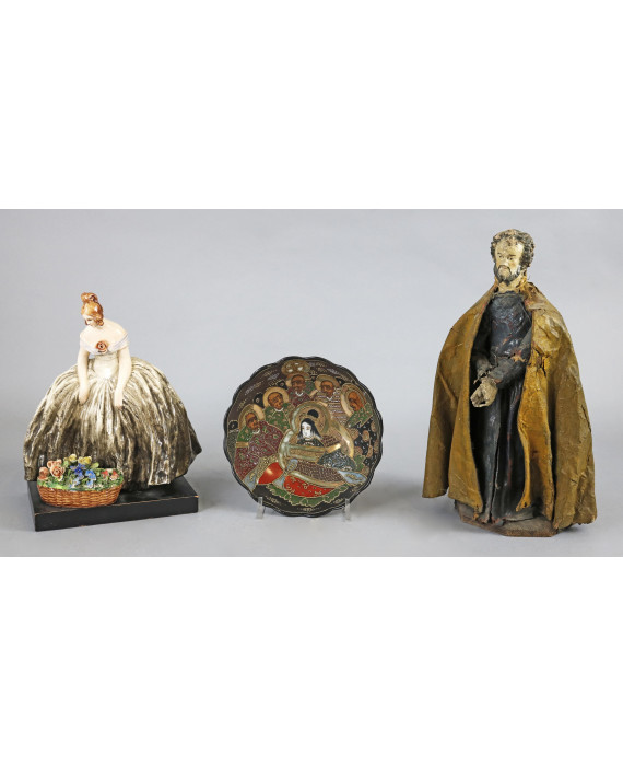 Lotto di una ciotola in porcellana dipinta con personaggi, di manifattura giapponese, una statuina in ceramica raffigurante gentildonna con cesto di fiori, firmata Cacciapuoti ed un'antica statuina in cartapesta raffigurante personaggio con mantello. Diam. cm20; alt. cm26/36 (difetti e mancanze)