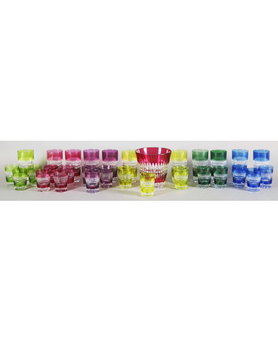 Servizio di bicchieri incompleto in cristallo policromo composto da 11 bicchieri da acqua, 18 da vino ed un portaghiaccio. (scheggiature a due bicchieri da vino)