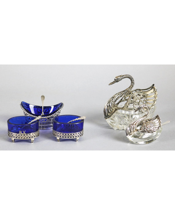Lotto di cinque salierine in argento 800 e vetro, di cui due a forma di cigno e tre con vaschette interne a fondo blu. Peso rilevabile dell'argento, gr. 75