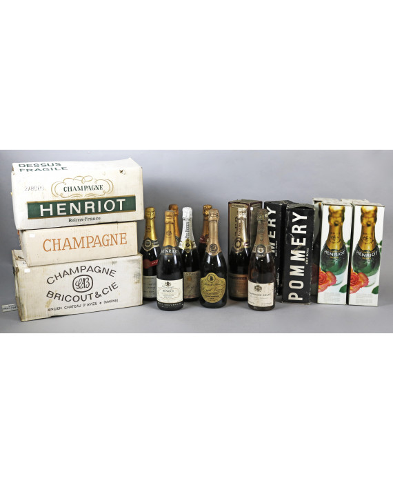 Lotto di 30 bottiglie di champagne da collezione: 6 di Bricout & Cie, 11 di Henriot Brut, 3 di Ayala & Co Chateau d'Ay, 2 di Pommery, 2 di Louis Roederer, una di Perrier Jouet & Co Epernay, una di Saint Simon, una di Pol Roger & Co, una di Deutz, una di Royal Virant ed una di Laurent Perrier
