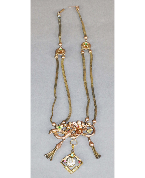 Collana in oro giallo 9Kt decorata con pietre ornamentali e perline. Peso gr. 20. Allegata dichiarazione di autenticità del perito Federico Perinelli della gioielleria lo Smeraldo