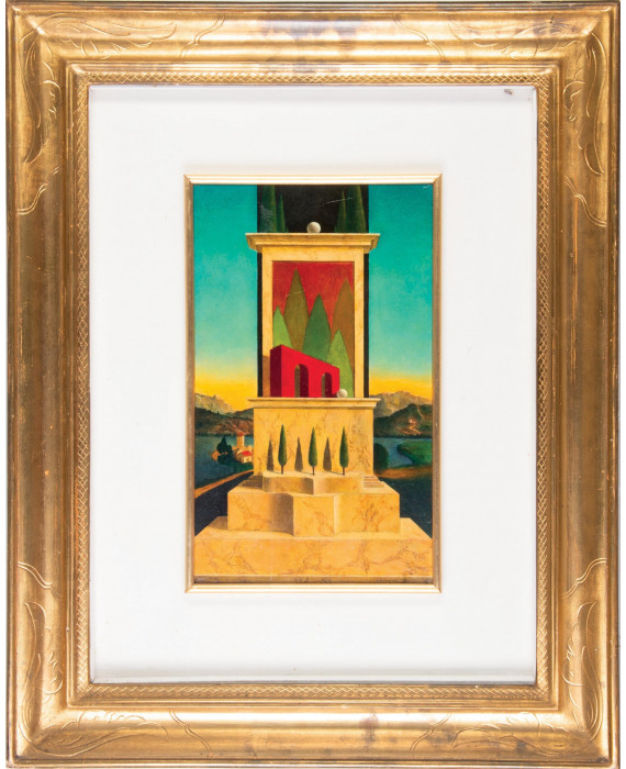 Composizione con cipressi e arcata rossa, 1990, con cornice