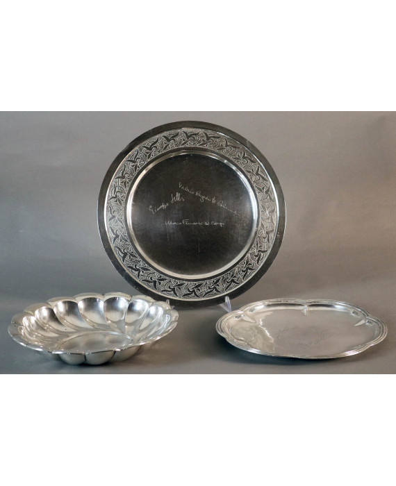 Lotto di tre vassoi in argento: uno di manifattura mediorientale con tesa incisa a volute vegetali con firme al centro, uno a corpo costolato con bolli Austria del sec. XIX ed uno con decoro floreali con bolli Malta del sec. XIX. Peso tot. gr. 1600