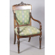 Poltrona in legno e radica di noce, gambe anteriori tornite ed intagliate, seduta e spalliera rivestite in stoffa