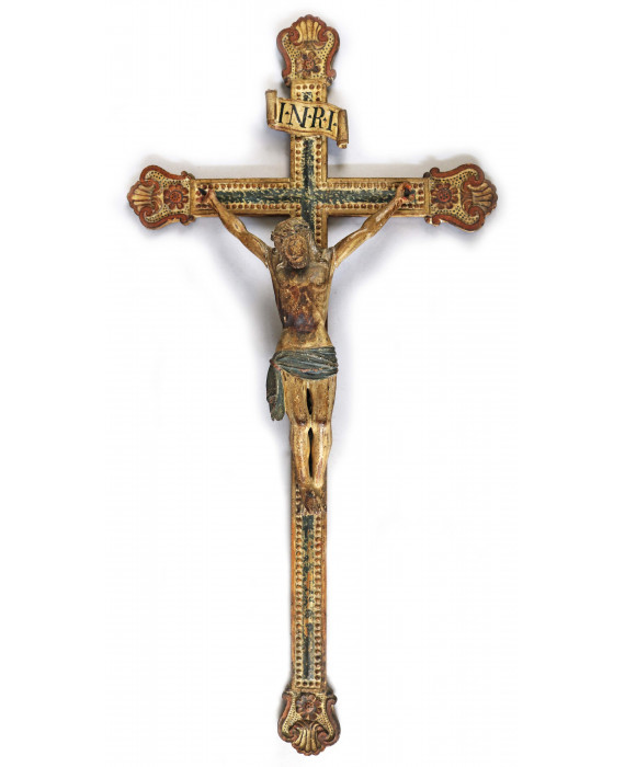 Crocifisso in legno dipinto in policromia ed intagliato con perlinature, fiori e conchiglie. Italia meridionale, sec. XVII. cm85x42 (lievi difetti e mancanze)