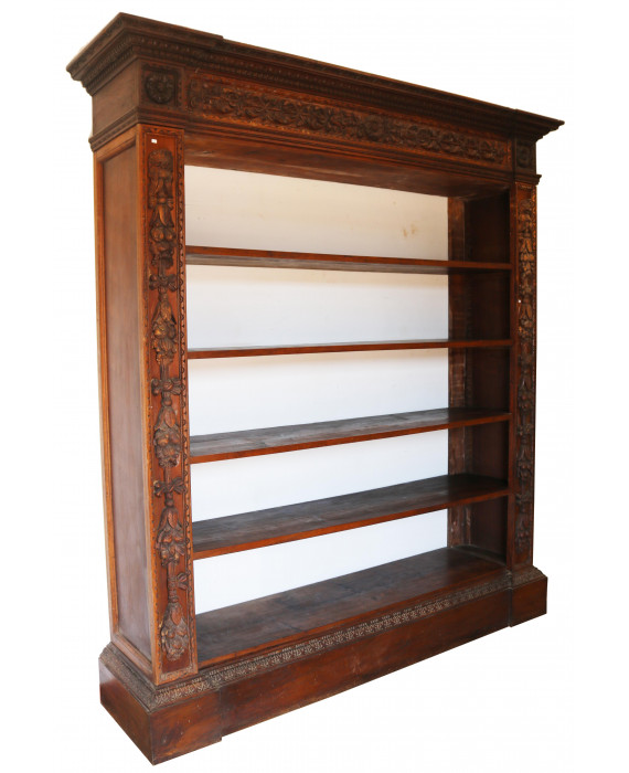Libreria a giorno in legno di noce con paraste laterali intagliate a mascheroni e festoni di frutta. cm235x202x47 (difetti)