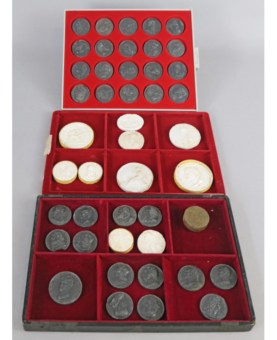 Raccolta di 45 calchi di medaglie e monete antiche in scagliola e gesso patinato bronzo. (difetti e mancanze)