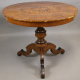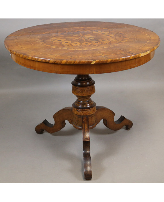 Tavolo sorrentino tondo impiallacciato in legno di noce ed intarsiato a motivi geometrici, fusto tornito su base a tripode. Napoli, sec. XIX. Alt. cm78; diam. cm97 (mancanze e difetti)