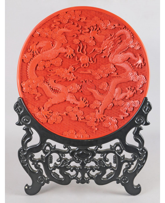 Piatto in lacca rossa lavorato a bassorilievo con dragoni e nembi, su treppiede ebanizzato e traforato. Cina, sec.XX. Diam. cm44