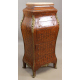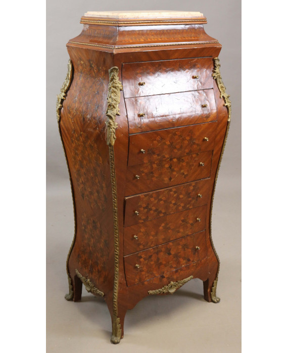 Particolare mobiletto a sette cassetti impiallacciato a marqueterie in legno di mogano e bois de rose, fronte e laterali bombati, piano in marmo. cm126x58x44 (difetti)