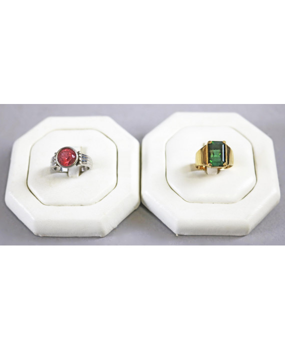 Lotto di due anelli in oro 18Kt: uno in oro giallo con tormalina centrale ed uno in oro bianco con pietra ornamentale di color rosa. Peso tot. gr. 11,60. Misure 11/9. Allegata dichiarazione di autenticità del perito Federico Perinelli della gioielleria Lo Smeraldo