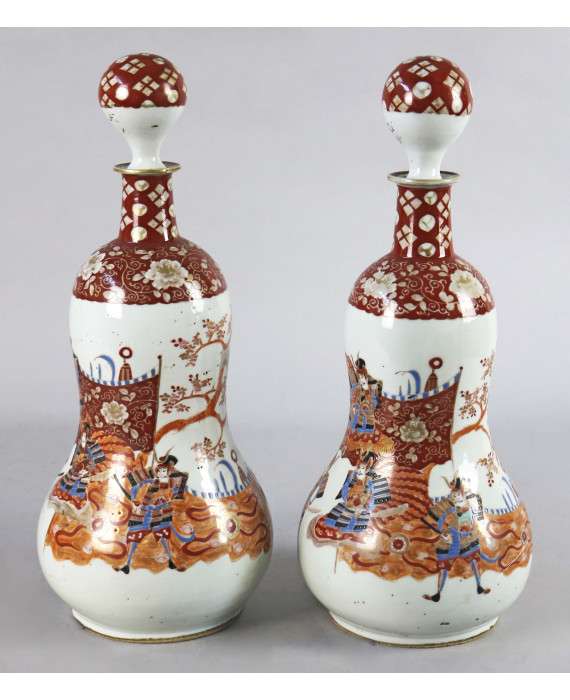 Coppia di vasi con tappo a doppia zucca in porcellana dipinta in policromia con samurai e rami fioriti. Giappone, fine sec. XIX. Alt. cm45 (filatura ad uno)