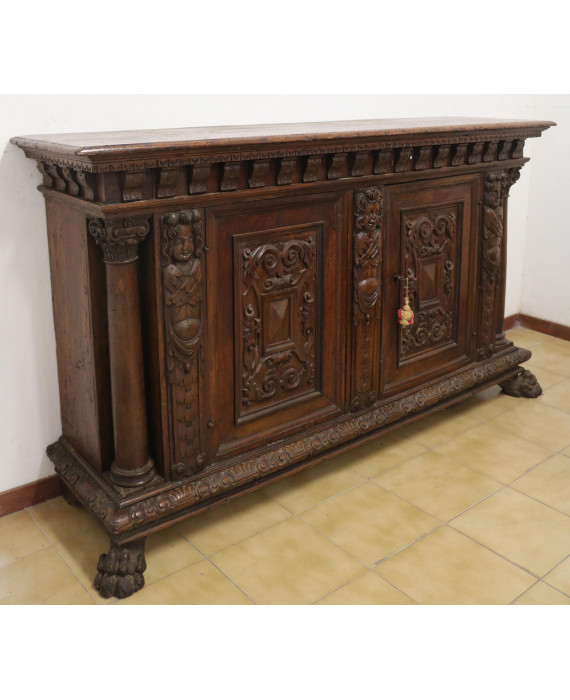 Credenza in legno di noce, due cassetti, due sportelli, colonnine laterali con capitelli intagliati, paraste a mascherone, gambe ferine. cm111x200x50 (dietti)