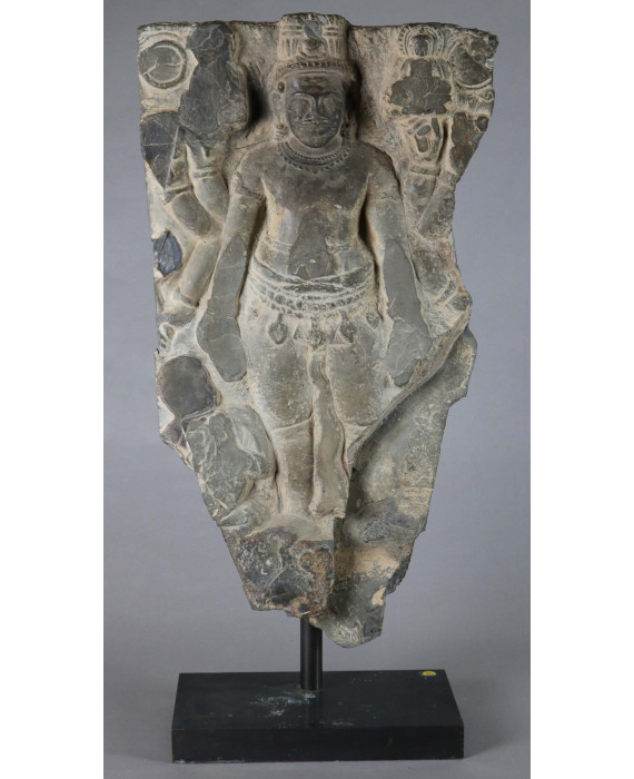 Scultura a bassorilievo in scisto con divinità ad otto braccia e Buddha, su base ebanizzata. Thailandia, sec. XIX. Alt. cm69