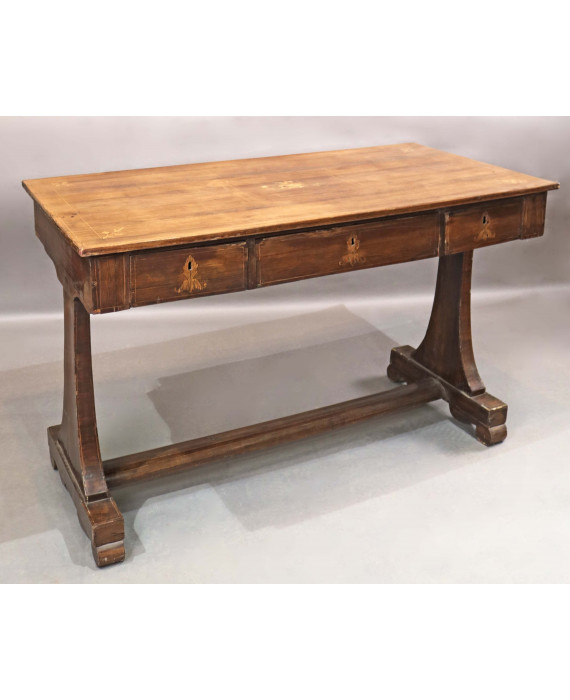 Scrivania impiallacciata in legno di noce, filettature ed intarsi floreali, tre cassetti, due sostegni laterali raccordati da traversa. Italia, sec. XIX. cm80x126x64 (difetti)
