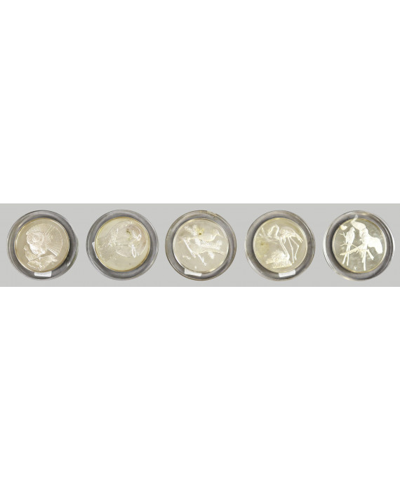 Serie di cinque medaglie in argento sterling con volatili sul dritto e verso inciso con numero seriale e nome della raffigurazione. Peso tot. gr. 325