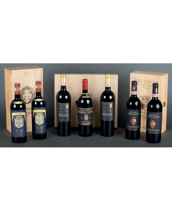 Lotto di sette bottiglie da collezione di Brunello di Montalcino: due bottiglie della fattoria Campo Giovanni San Felice del 2000, due bottiglie della Fattoria dei Barbi Cinelli Colombini del 2004 (bottiglie numerate), due bottiglie Casato Borghese del 2006 ed una di Biondi Santi Tenuta Greppo del 2004 (bottiglia numerata)