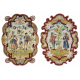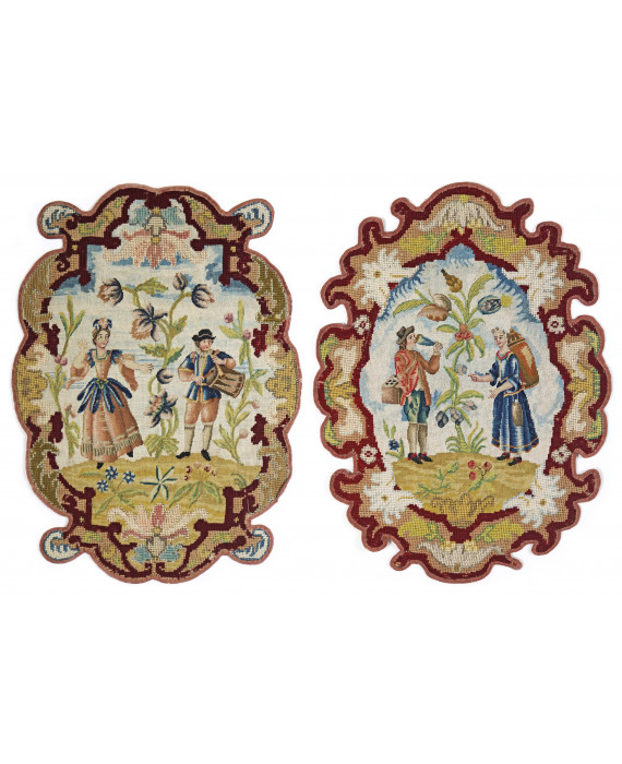 Lotto di due pannelli in tessuto ricamato in policromia con personaggi in costume d'epoca. Italia, sec. XIX. cm48x36; cm50x37
