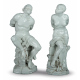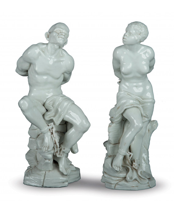 Schiavo e schiava moreschi modellati con i polsi incatenati, seduti su una roccia contro un ceppo d'albero. Coppia di rare e importanti statuine in porcellana bianca. Ginori a Doccia, 1760-1770 circa. Le figure derivano dal monumento cinquecentesco di Pietro Tacca (1570-1640), detto dei Quattro Mori, a Livorno, per celebrare il trionfo della famiglia Medici sugli Ottomani. Alt. cm24,5/25,5 (mancanze alla catena, alle dita delle mani e al dito di un piede della schiava e restauro al braccio) Bibliografia: Rita Balleri. Copiare, rielaborare e inventare i modelli di scultura presso la fabbrica Ginori nel XVIII e XIX secolo. The French Porcelain Society Journal, vol.VI, pp.163-182, 2016