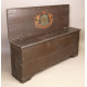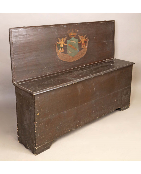Panca a tre posti in legno laccato e dipinta con stemma araldico della famiglia Mercuri. Italia, sec. XIX. cm100x137x30 (lievi difetti)