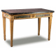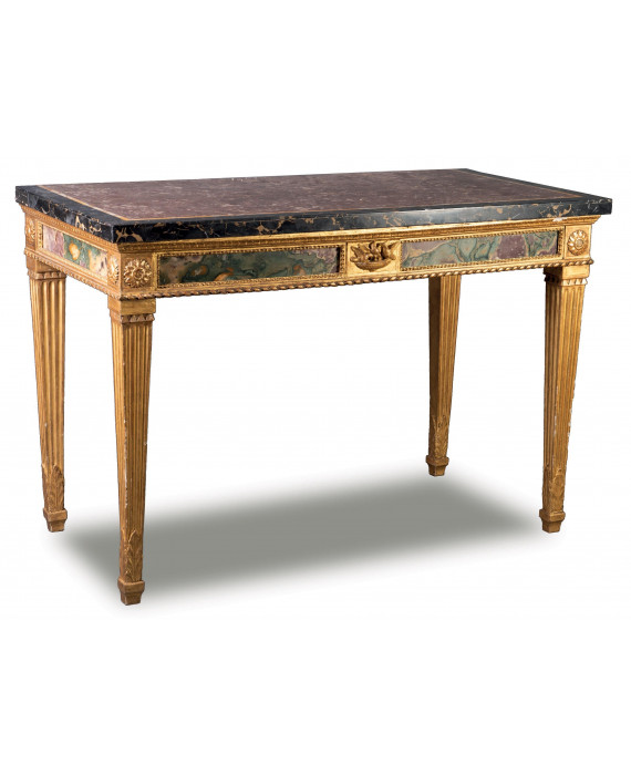 Elegante console in legno e stucco dorato, grembiale con riquadri in marmi policromi, gambe piramidali scanalate, piano lastronato in marmo portoro, onice e marmo rosso con fossili. cm89x133x66 (piccole mancanze alla doratura)