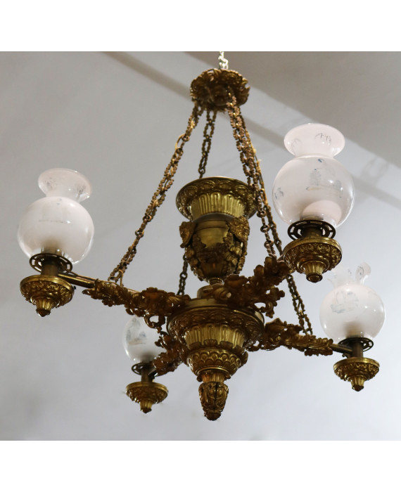 Lampadario a quattro luci in bronzo dorato e lavorato a volute vegetali e fiori, con bobeche in vetro dipinte con allegorie delle quattro stagioni (lievi difetti e rotture e mancanze ad una bobeche)