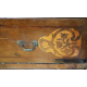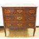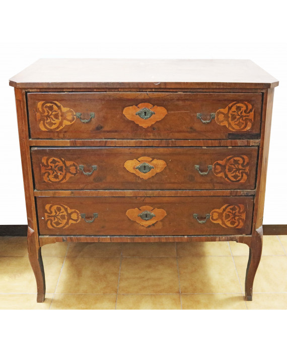 Comò impiallacciato in legno di noce, intarsi a volute e fiori in legni chiari, tre cassetti, gambe mosse. Italia, inizi sec. XIX. cm92x106x58 (difetti e restauri)