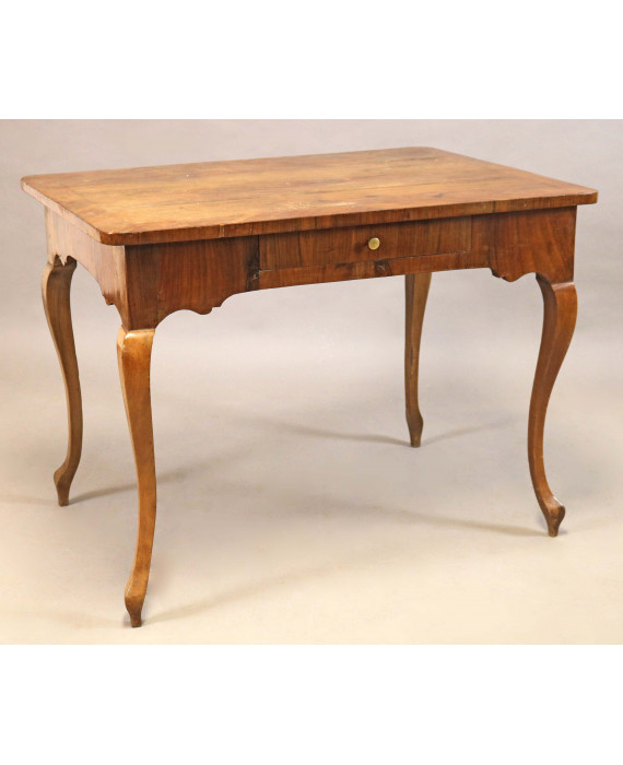 Tavolo scrittoio lastronato in legno di noce, un cassetto, gambe mosse. Italia, fine sec. XVIII. cm74x98x68 (difetti)