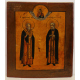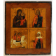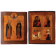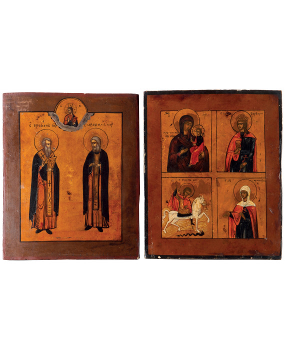 Lotto di due icone russe del sec. XIX di cui una quadripartita raffigurante Madonna con Bambino e Santi l'altra raffigurante due santi in pedi sotto a Gesù, sul fronte iscrizioni in cirillico