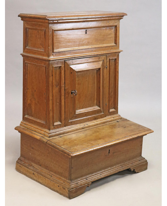 Inginocchiatoio in legno di noce, piano superiore apribile, uno sportello, piano d'appoggio apribile. Italia, sec. XVIII. cm95x67x53