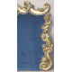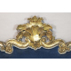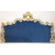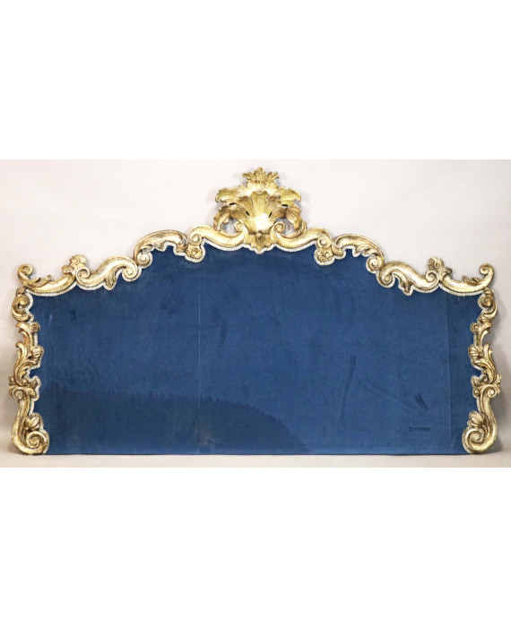 Testata di letto matrimoniale in legno dorato ed intagliato a volute vegetali, con foderatura in velluto blu. Italia, sec. XIX (restauri e difetti)