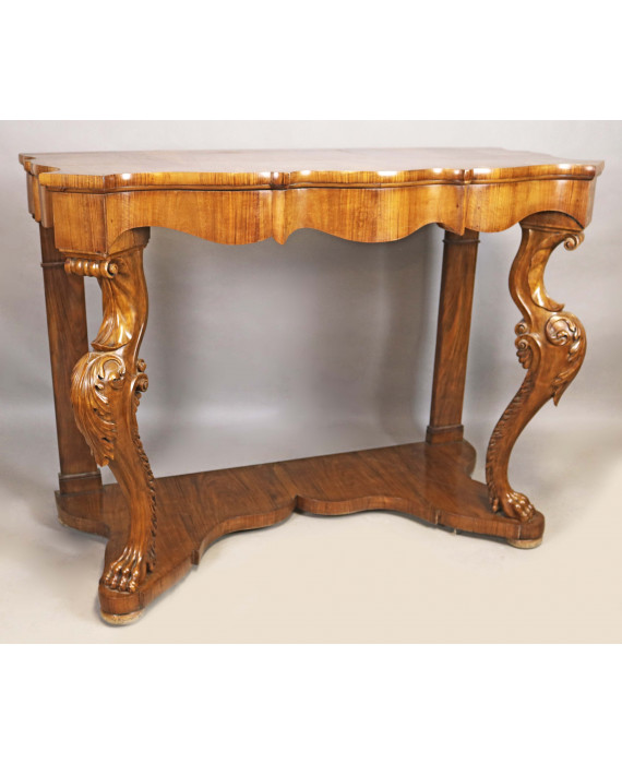 Console impiallacciata in legno di noce con due sostegni anteriori intagliati a volute terminanti a zampa su pianetto inferiore. Italia, sec. XIX. cm97x130x64 (lievi difetti)