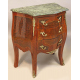 Coppia di comodini impiallacciati in legno di mogano, tre cassetti, applicazioni in bronzo dorato, fronte e laterali mossi, piani in marmo verde. cm73x65x38 (piccole mancanze all'impiallacciatura)
