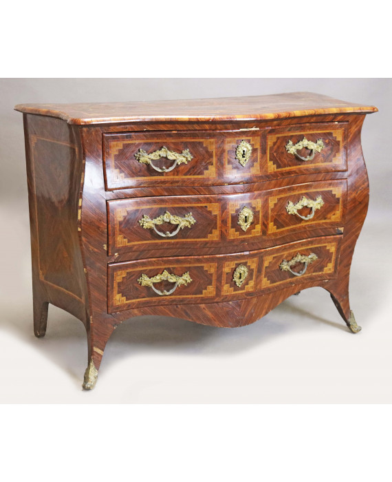 Elegante comò a tre cassetti interamente lastronato in bois de violet con filettature ed intarsi in bois de rose e acero, fronte e laterali bombati, peducci anteriori in bronzo. cm100x135x64 (lievi mancanze)