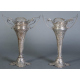 Coppia di eleganti vasi biansati con bordo superiore traforato a volute vegetali, fusto e base lavorate con foglie lanceolate e serti floreali. Bolli Sheffield 1908-1909, argentiere Walker & Hall. Alt. cm33. Peso tot. gr. 1020