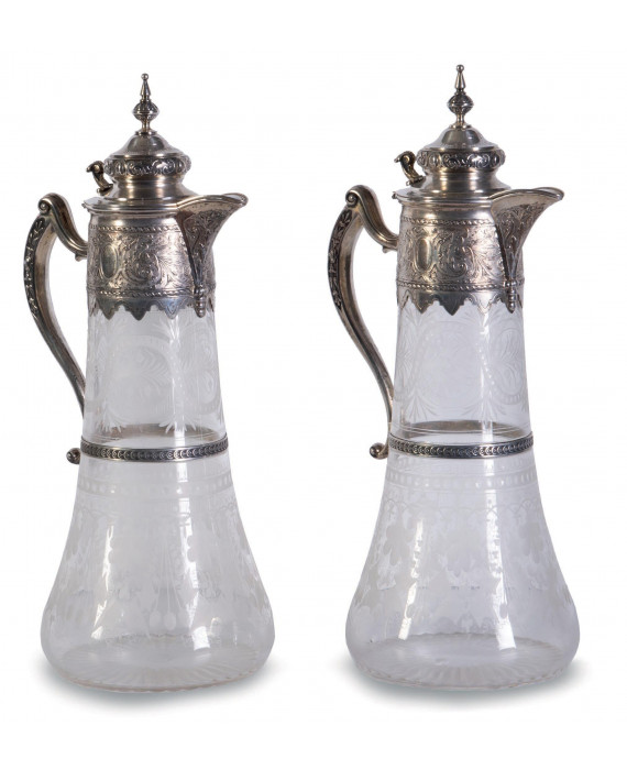 Coppia di eleganti decanter in cristallo inciso con serti vegetali, collo manico e coperchio in argento 800 firmato Schurmann, con iscrizione datata sul tappo 4 settembre 1880. Belgio, sec. XIX. Alt. cm32