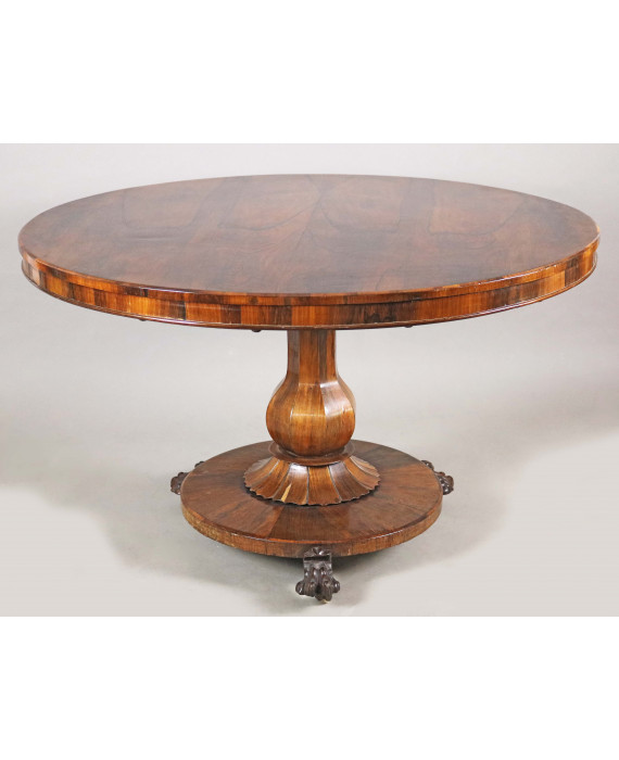 Elegante tavolo tondo a vela impiallacciato in legno di palissandro, fusto a balaustro poggiante su base tonda su tre piedi a zampa ferina. Francia, sec. XIX. Alt. cm78; diam. cm126 (lievi difetti)