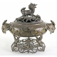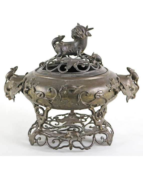 Incensiere in bronzo patinato e lavorato con volute vegetali, fiori, topolini in rilievo e pomolo a cane di Pho. Vietnam, sec. XIX. Alt. cm33; diam. cm40